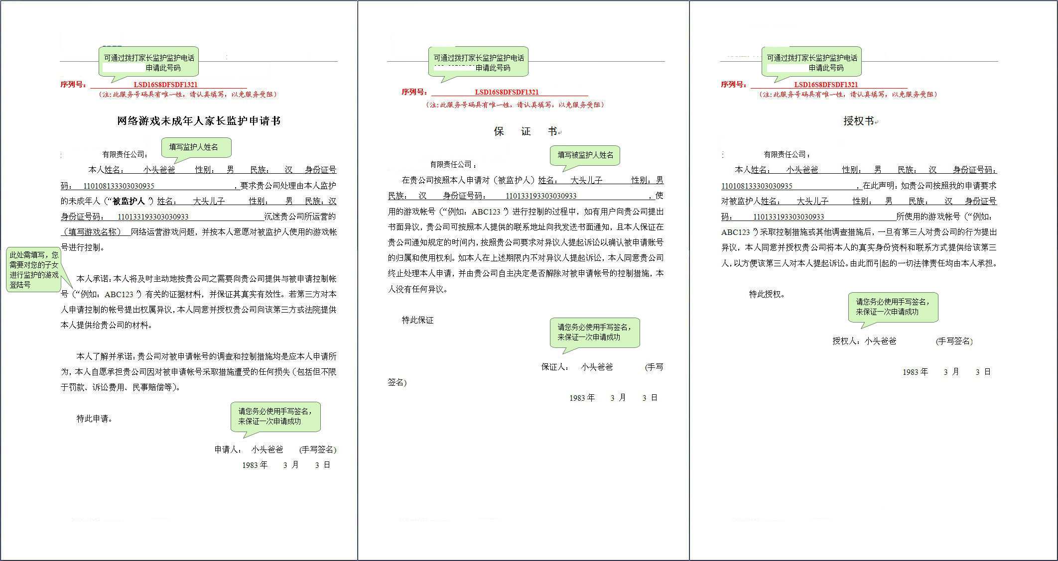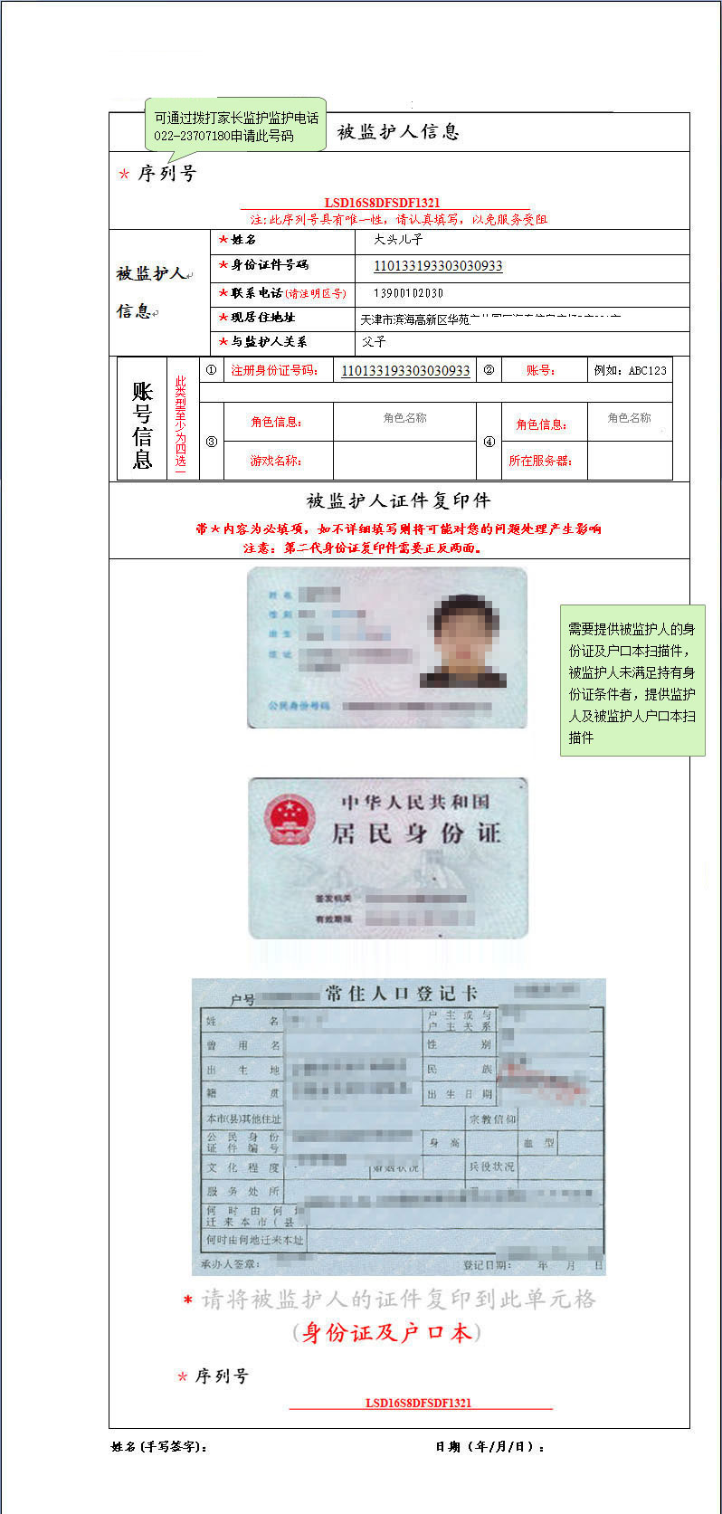 1、監(jiān)護(hù)人需要進(jìn)行監(jiān)護(hù)申請時(shí),撥打?qū)>€電話17719861303,提交被監(jiān)護(hù)人賬號、所玩的表演、服務(wù)器、監(jiān)護(hù)人聯(lián)系電話后,即可獲得服務(wù)申請序列號;