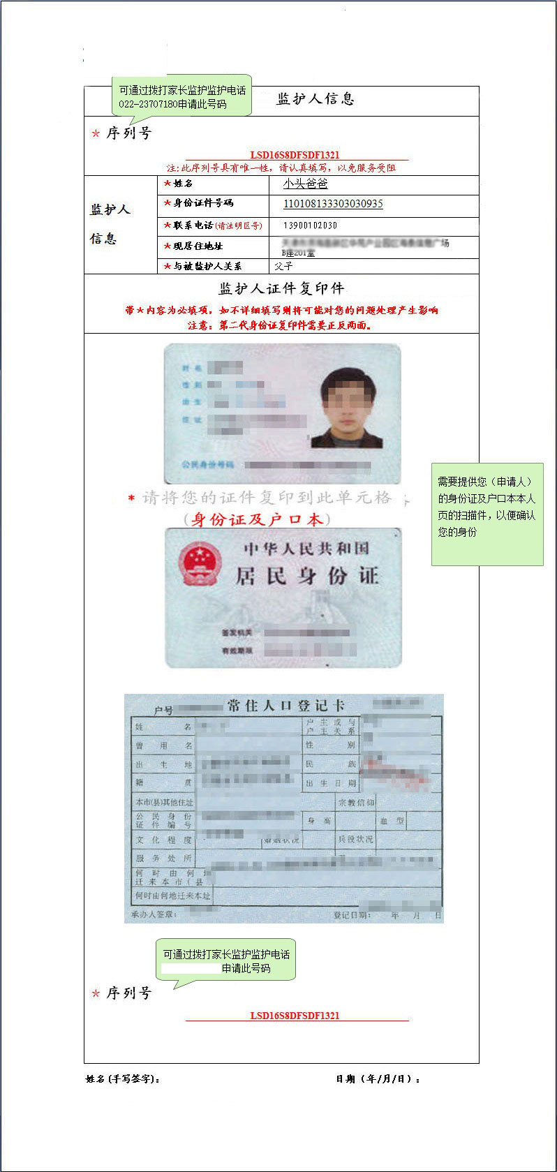 2、監(jiān)護(hù)人可在國富(鄭州)網(wǎng)絡(luò)科技集團(tuán)有限公司家長監(jiān)護(hù)系統(tǒng)中下載相應(yīng)的申請表單,下載完畢后,根據(jù)表單中的要求進(jìn)行填寫并手寫簽名,簽名完畢后,連同戶口本掃描件,發(fā)送至國富(鄭州)網(wǎng)絡(luò)科技集團(tuán)有限公司客服中心,發(fā)送方式如下: