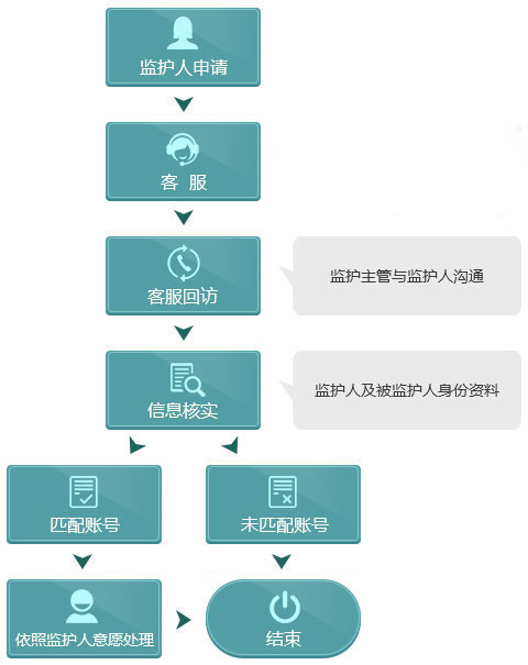 A:我們在收到您的信息,審核后,會(huì)在收到信息的48小時(shí)之內(nèi)與您取得聯(lián)系,對該服務(wù)進(jìn)行說明,并明確告知是否需要您的后續(xù)配合。待最終確定賬號無誤后,我們將對賬號進(jìn)行監(jiān)控,同時(shí)我們會(huì)安排監(jiān)護(hù)人、被監(jiān)護(hù)人與監(jiān)護(hù)主管三方進(jìn)行三方通話,在最終確認(rèn)的情況下,我們會(huì)根據(jù)監(jiān)護(hù)人的意見會(huì)賬號進(jìn)行處理。