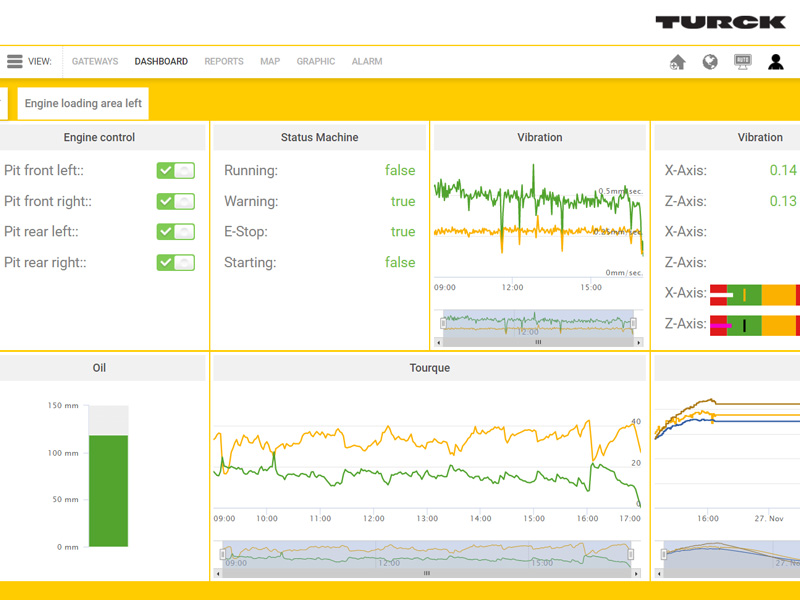 當前的機器數據和狀態(tài)顯示在操作面板,例如圖爾克云中。用戶可以執(zhí)行不同的設置,以及設置在超出閾值時通過電子郵件或SMS發(fā)送通知等。該界面可以單獨調整,并且可以在需要時采用客戶自己的設計風格。